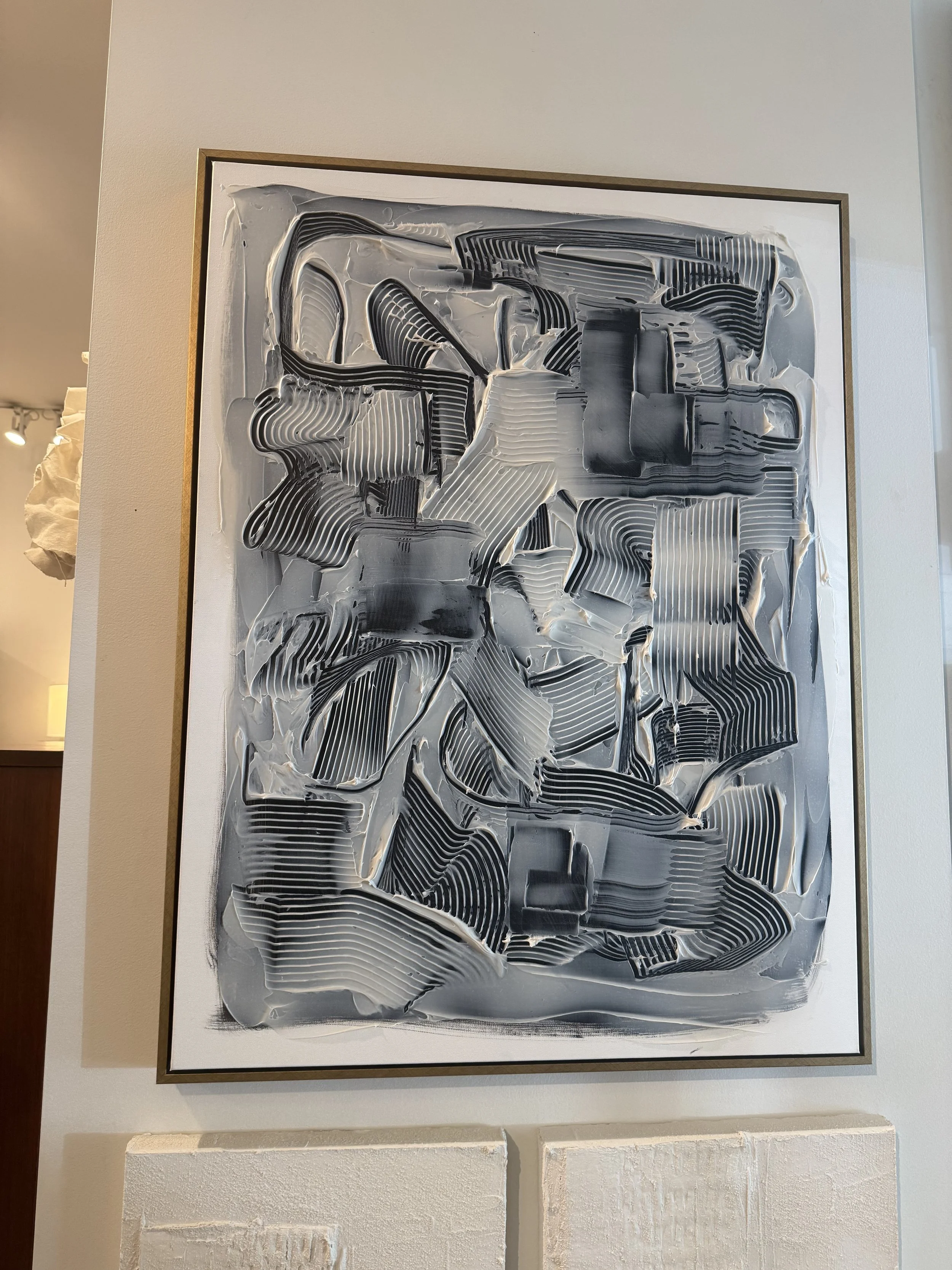 One of our favorite pieces currently on display at City Haus is All Things Go 1. The first in a series of paintings, these truly feel like quintessential Sikora pieces with its lines and shapes that hint toward a piece of her past. While lines aren’t her only motif, the line work is strong. The disjointed patches of white lines fragment what your brain tries to make sense of– a piece of work you can spend hours looking upon! Each one of SIkora’s pieces are one-of-one and make a wonderful investment into your art collection!
